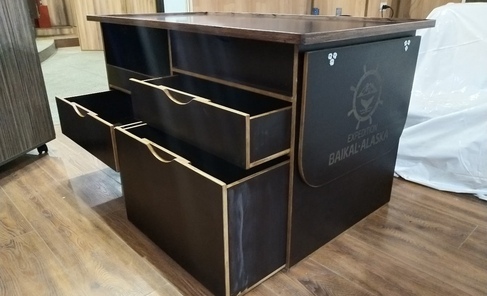 Стол бортовой выполнен из фанеры неламинированной 12мм с обработкой торцов у деталей изделия полимерным клеем, петли из нержавеющей стали.